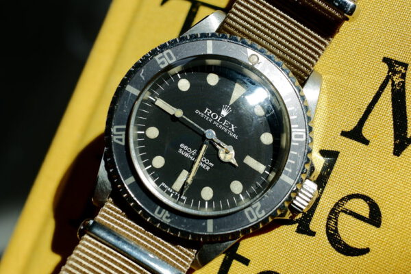 Description: 1977 Rolex 5513 Maxi I Dial. The Maxi dial 5513’s are the purist’s ideal 5513. It is simple with no date wheel, no cyclops, and features large “maxi” lume plots that are bigger than the previous serif and non-serif 5513 submariners. This makes the Mark I Maxi dial a highly desirable watch considering it is the only maxi dial watch with the Submariner text below the depth rating. Subsequent Maxi dial variants had the text flip flopped with “submariner” taking the top line and the depth rating on the bottom. This specific Mark I Maxi has a beautiful fat font insert that has a beautifully faded grey luster to it. The case was recently refinished by LA watchworks in Pasadena CA. The original chamfers were highlighted and brought back. A tropic 39 crystal replaced the original crystal to give it a practical every day use water resistance. (We highly recommend replacing original crystals as they tend to not hold up against even the lightest of water use or humidity especially since they are often 30+ years old). The lume on this one has faded into a muted Khaki. It is very reminiscent of military desert colors.