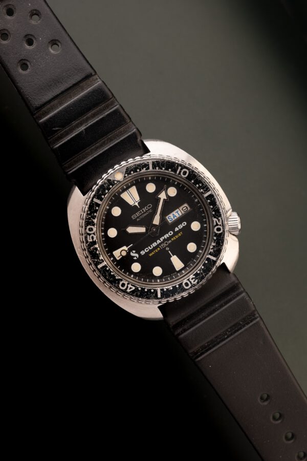 Description: The Seiko Turtle is an iconic dive watch. The 6306 variant was a Japan domestic release watch that features both English and Japanese days. What makes this turtle truly special is that this is a double named watch, that was co-branded with the diving tool company Scubapro. These rare birds are an affordable entry into something truly rare and special. It is believed that there is less than 1000 of these made and were only distributed to the Japanese market. This watch appears unpolished and retains rich yellow lume. These watches are often faked and dials printed with Scubapro font, however for those that have come across there fair share, there are distinctive traits that are needed to be a true Scubapro450 original watch.