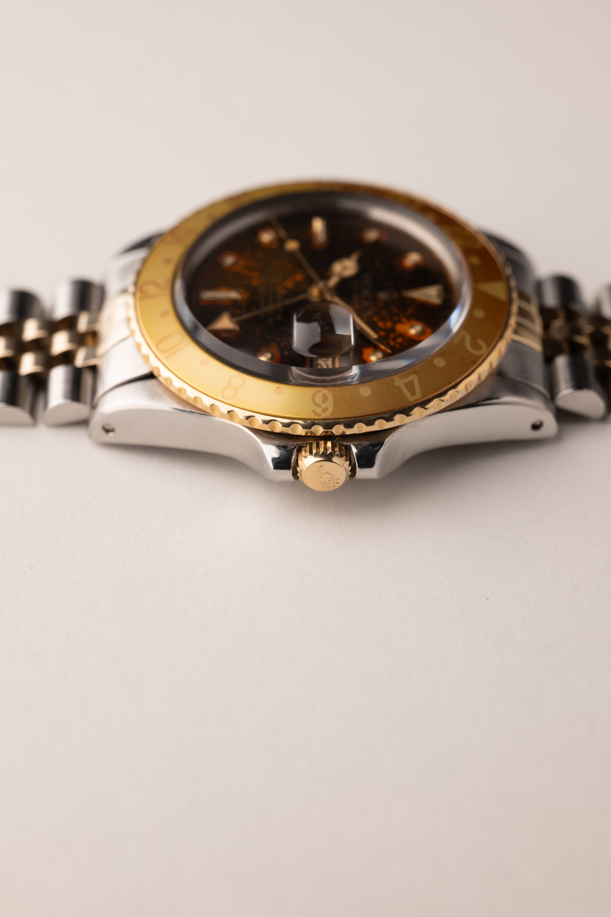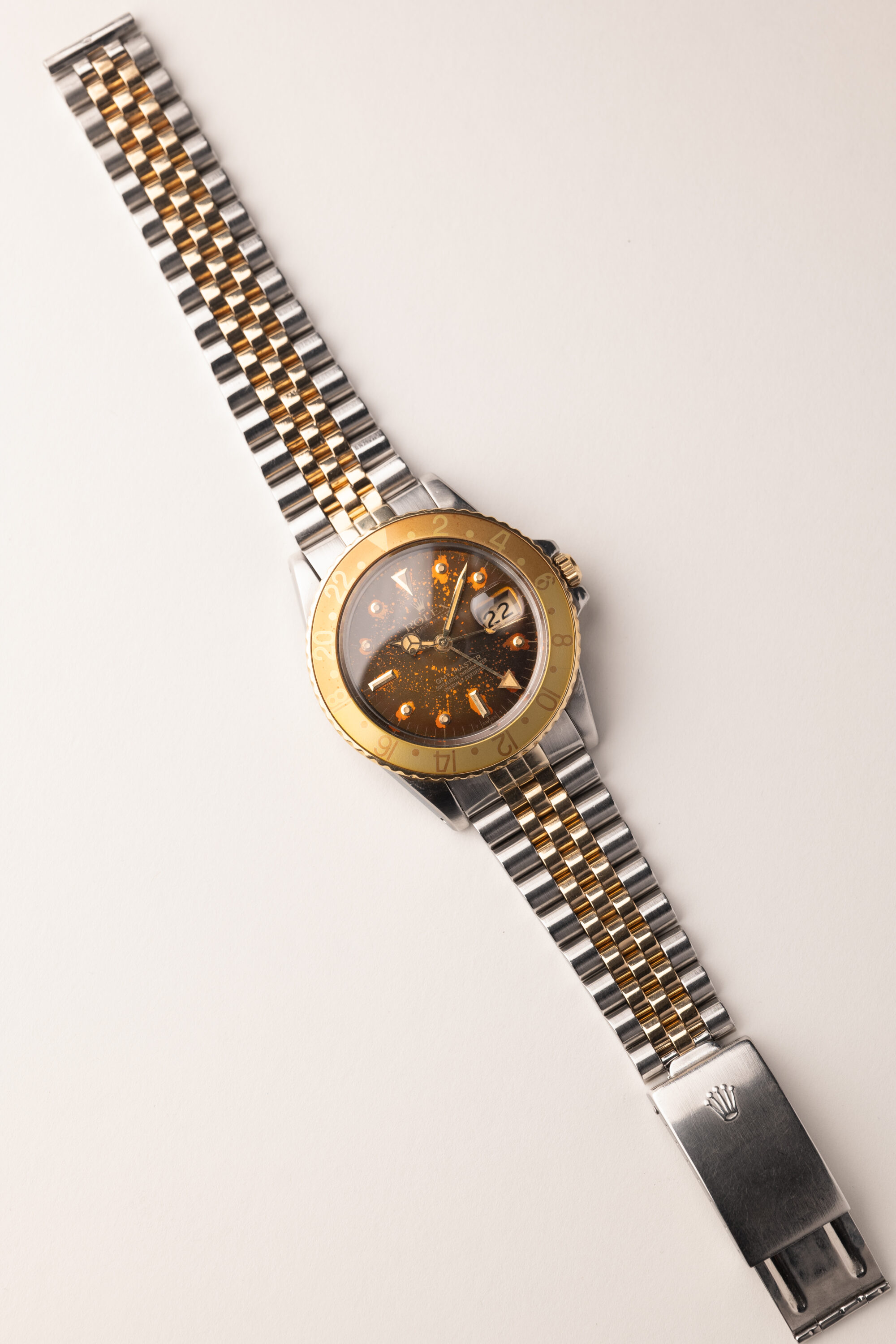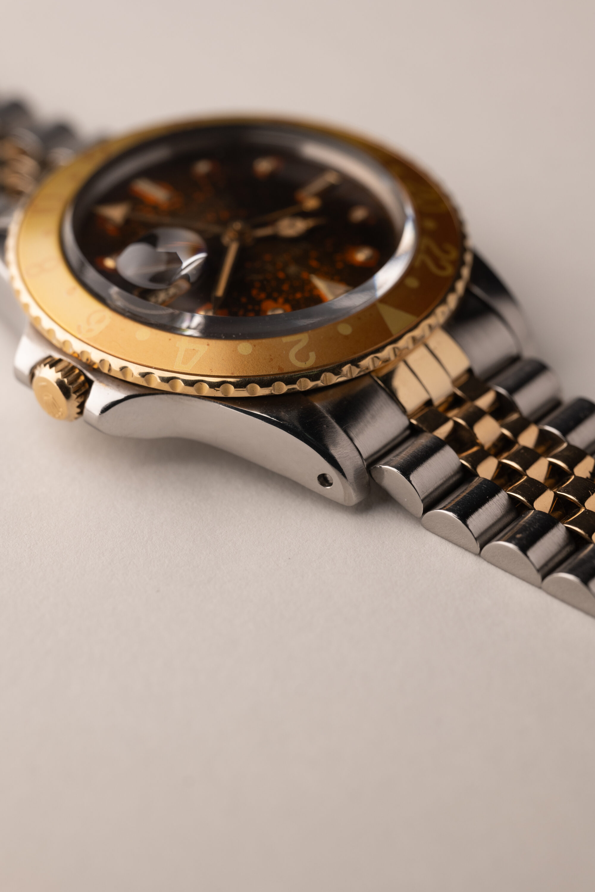 Description: The two-tone Rootbeer GMT needs very little of an introduction. First seen on father’s in the 70’s and 80’s and was often alway accompanied by a meaty mustache, this Rootbeer GMT however has gone from coffee brown dial to an acid magma complexion. We love these nipple dial rootbeer models as they encapsulate the time period. The tropical dial is an amazing look that’s sure to set itself apart from any other 16753 in the mix.