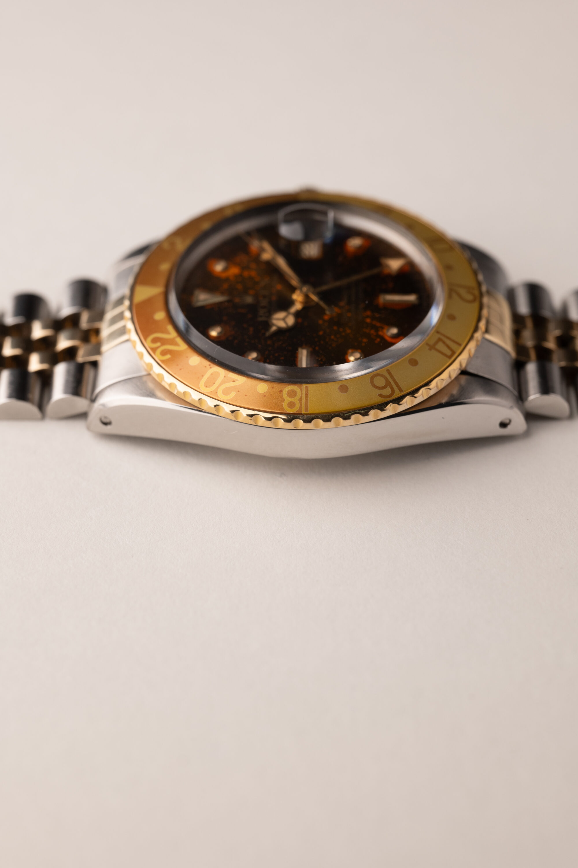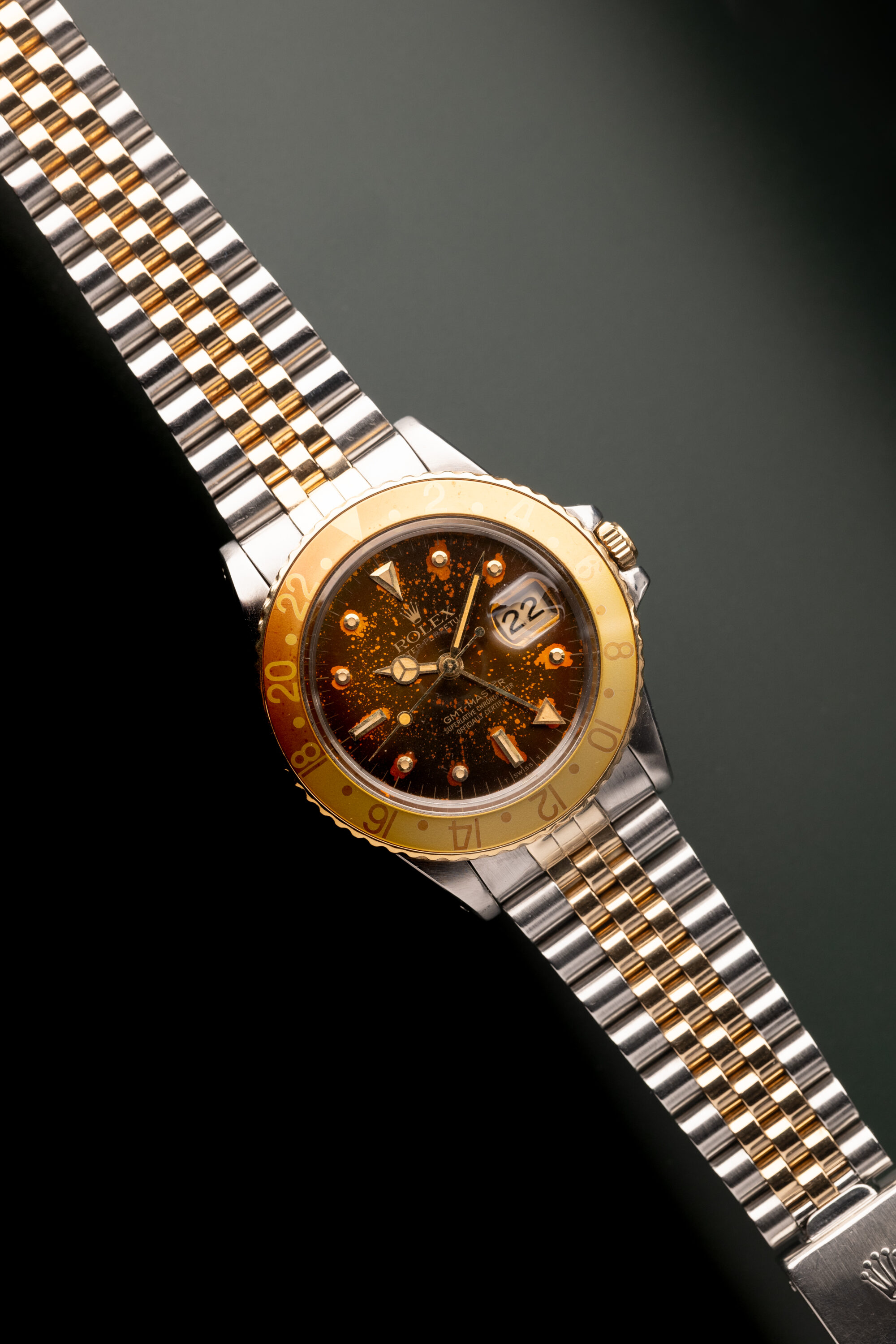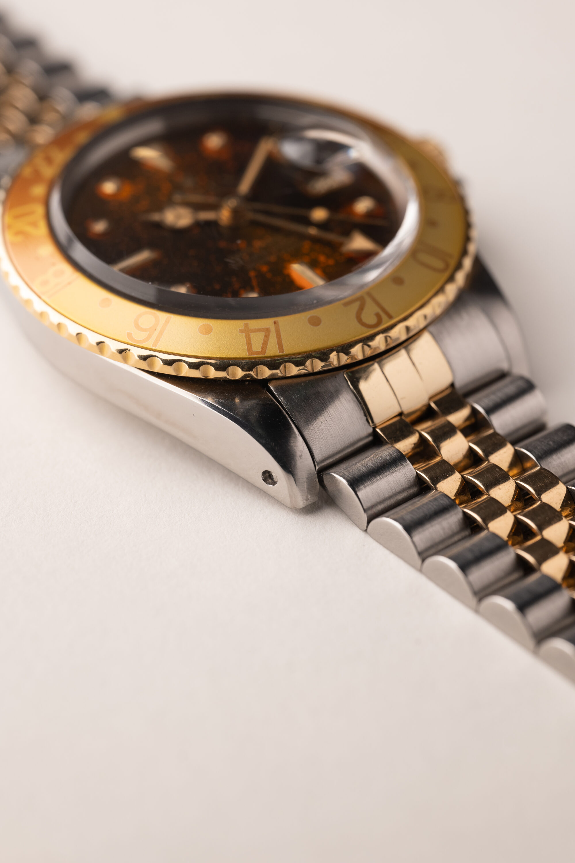 Description: The two-tone Rootbeer GMT needs very little of an introduction. First seen on father’s in the 70’s and 80’s and was often alway accompanied by a meaty mustache, this Rootbeer GMT however has gone from coffee brown dial to an acid magma complexion. We love these nipple dial rootbeer models as they encapsulate the time period. The tropical dial is an amazing look that’s sure to set itself apart from any other 16753 in the mix.