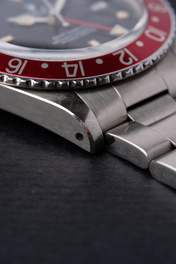 Description: 1986 Rolex 16750 GMT Pepsi. This 16750 is an excellent example of an early white gold surround Pepsi GMT. The lume on the dial has taken on an even yellow and is a nice contrast to the gloss dial. A stand out feature is the very thick lugs and crown guards on the watch.