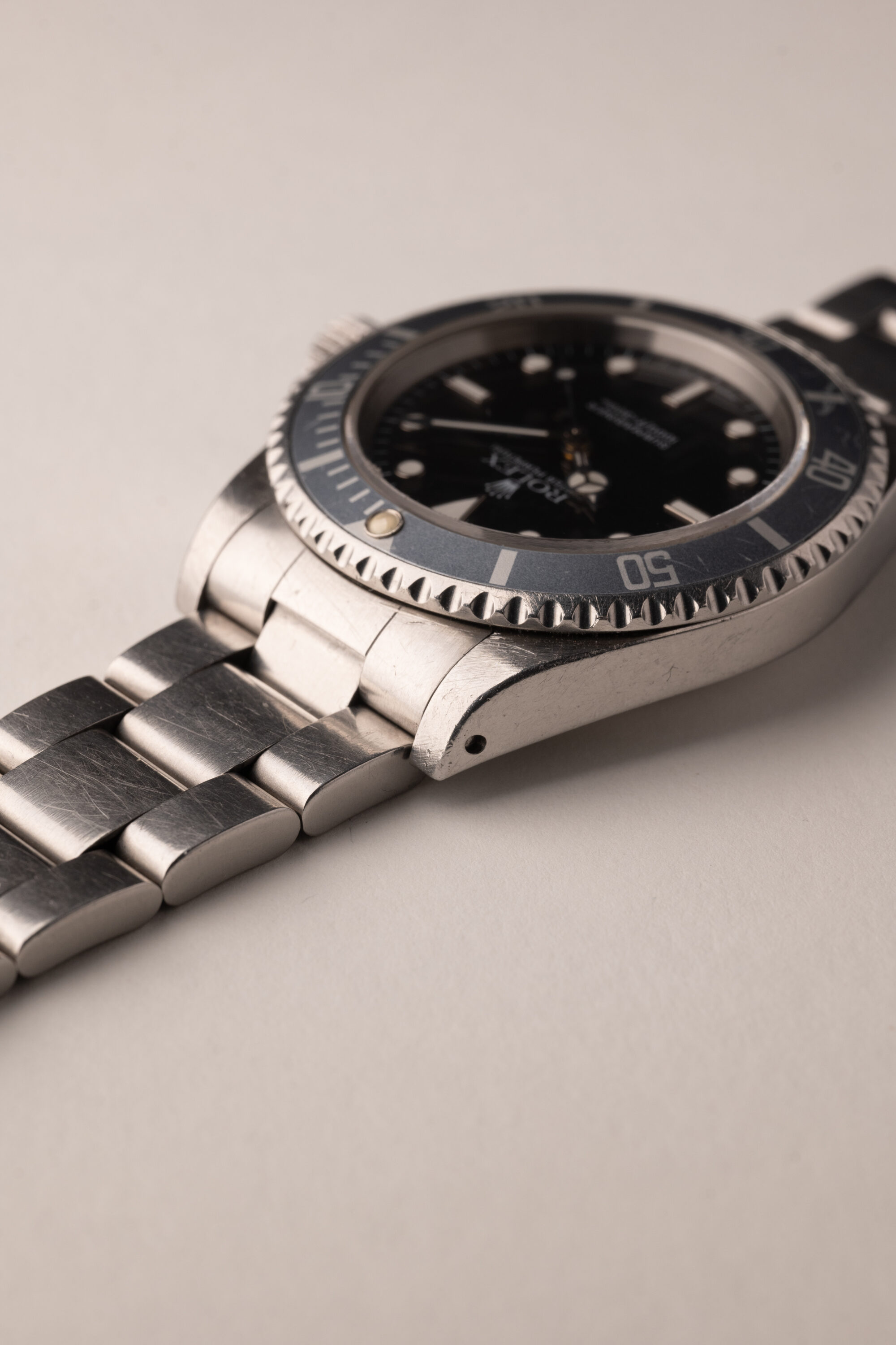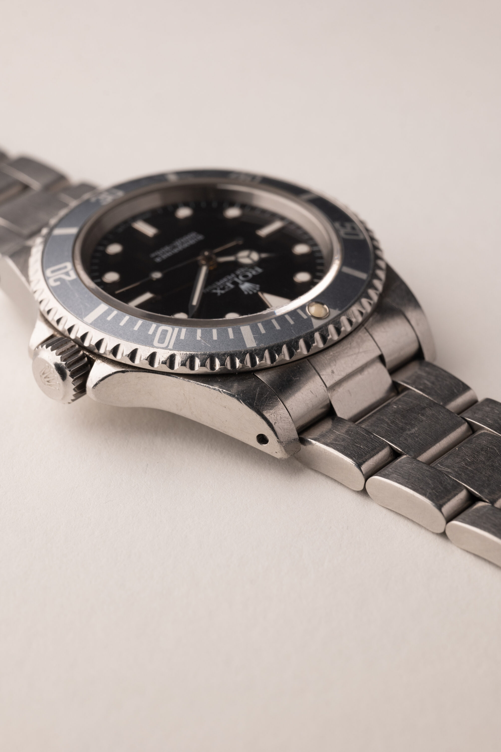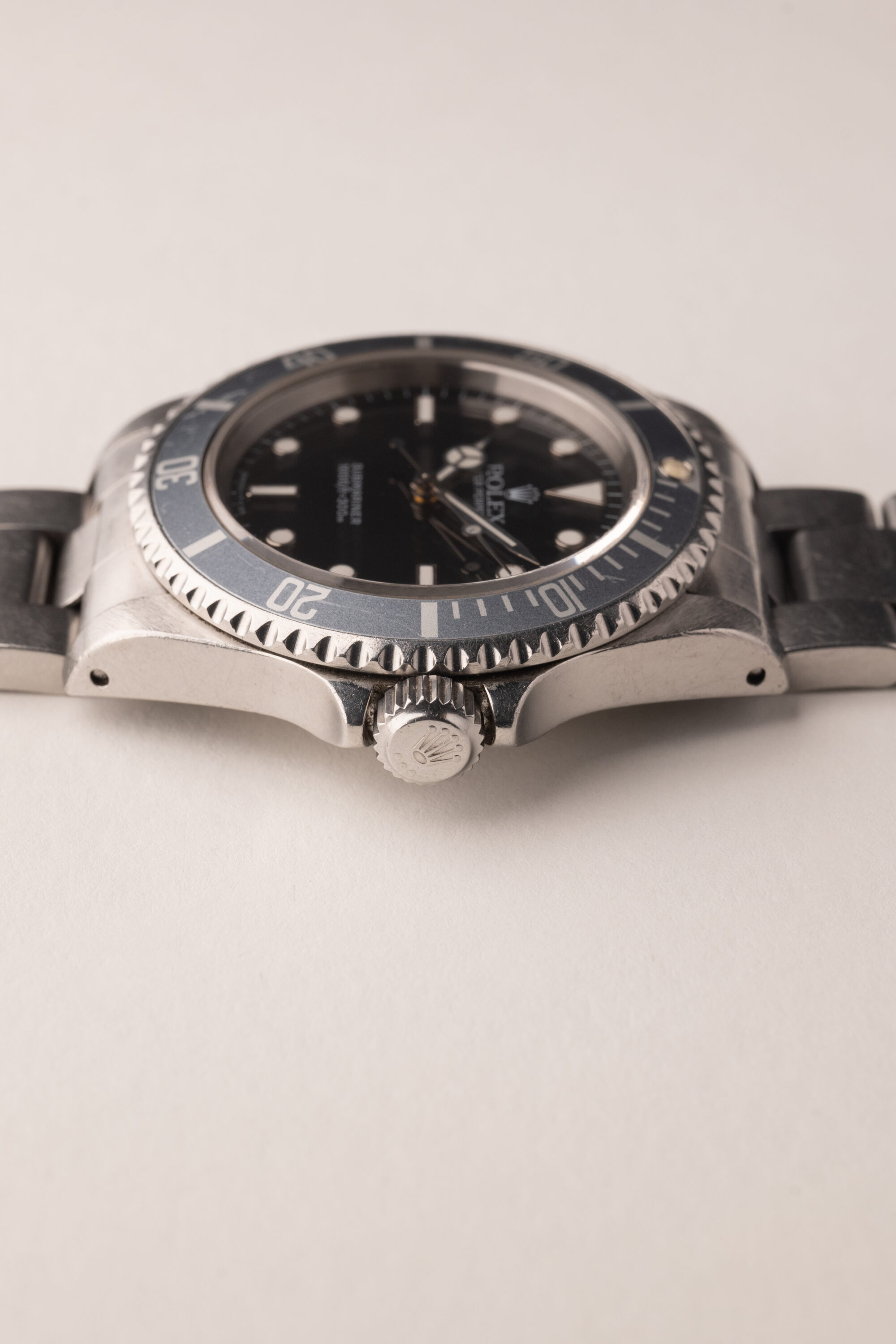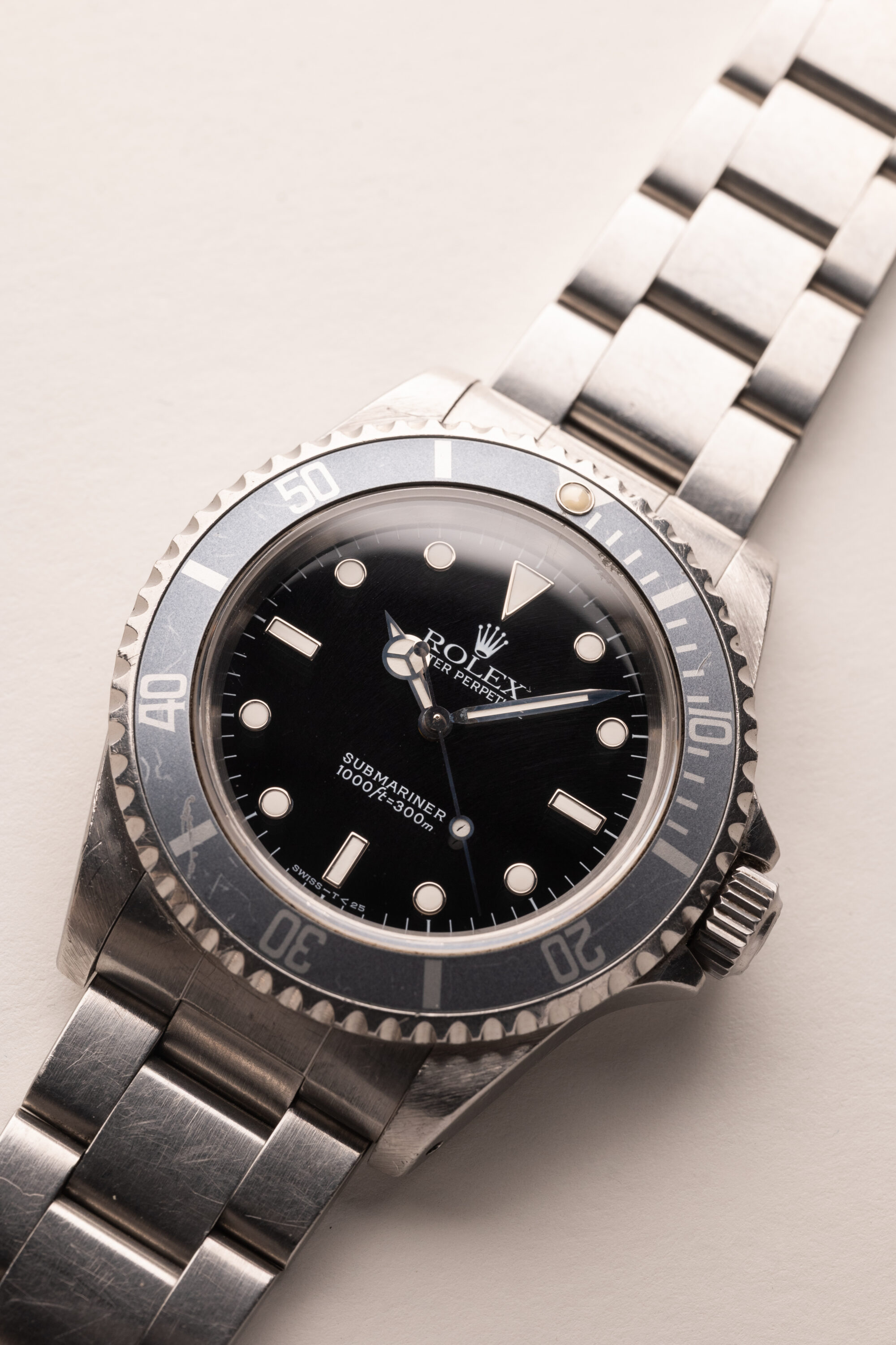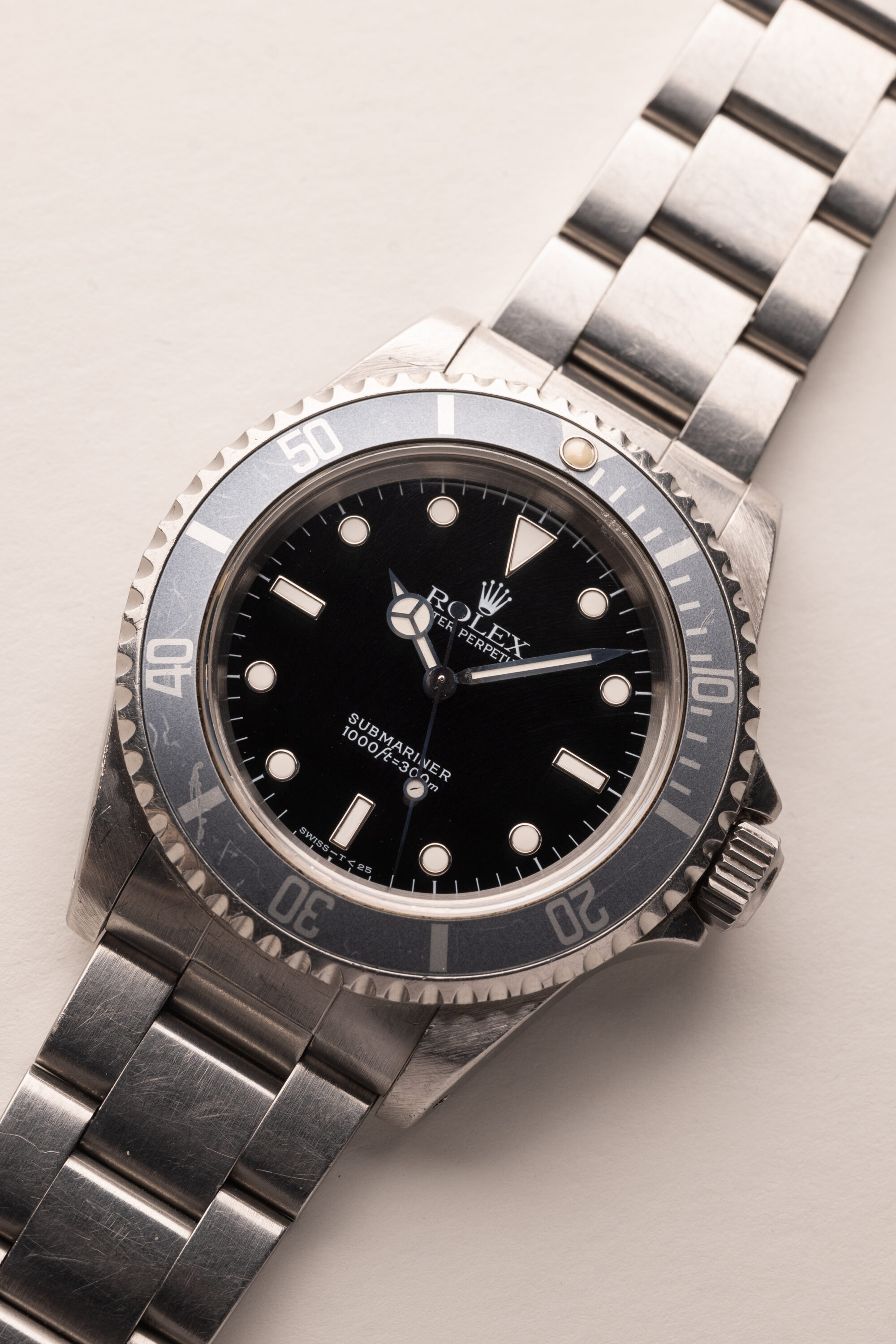 Description: Out of the Neo-Vintage watches that have gained tremendous popularity over the past few years perhaps none have been more overlooked than the 14060 no date Submariner. Produced in far fewer numbers than the more popular 16800 reference, this Sub model provides a clean symmetrical dial without cluttering up the face of the watch with a date function or cyclops. The minute hand is missing some lume, and resembles a lighting bolt through the hand. Insert has turned into a ghost shade of grey. Unpolished case and deep glossy dial make this 14060 one not to pass up.