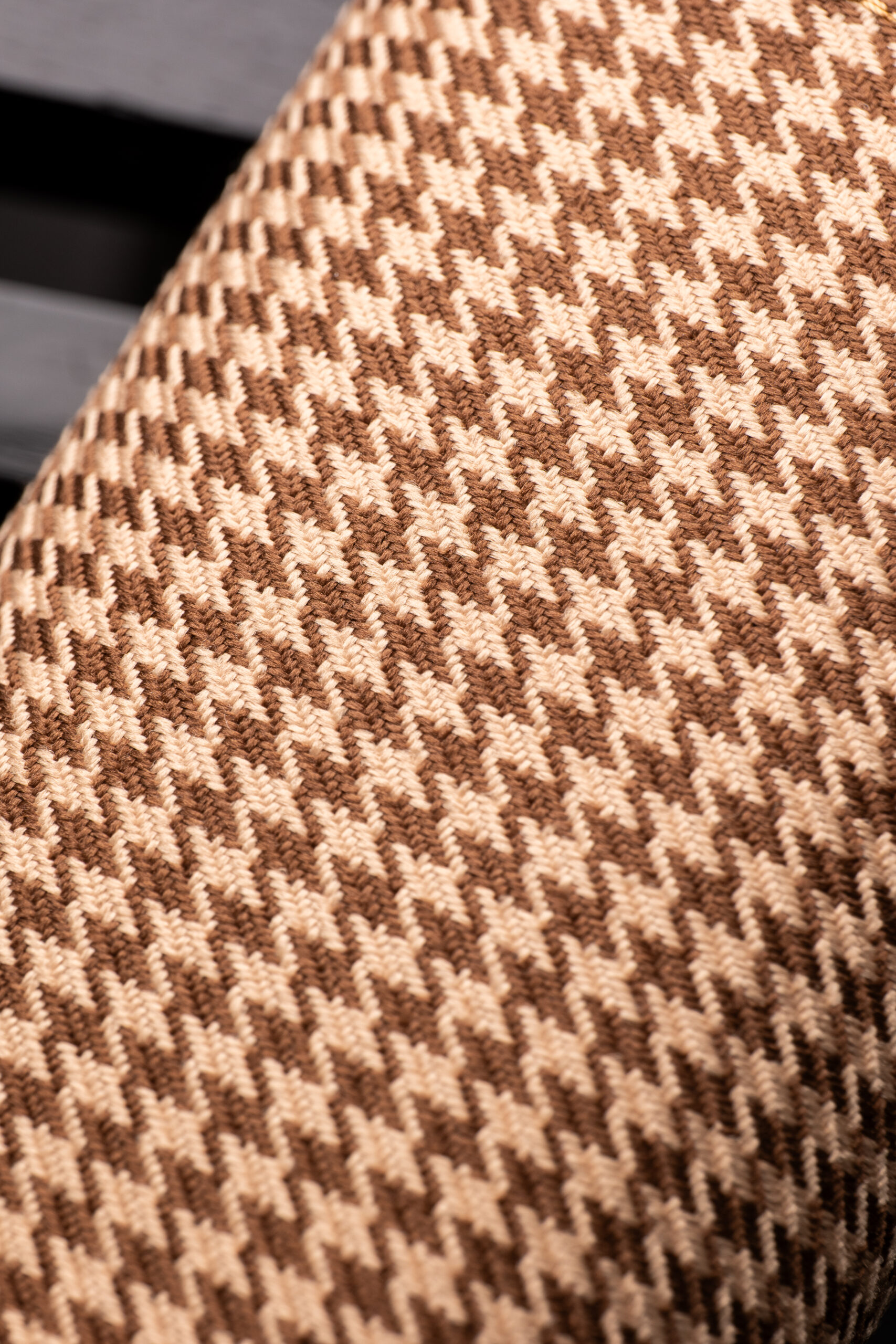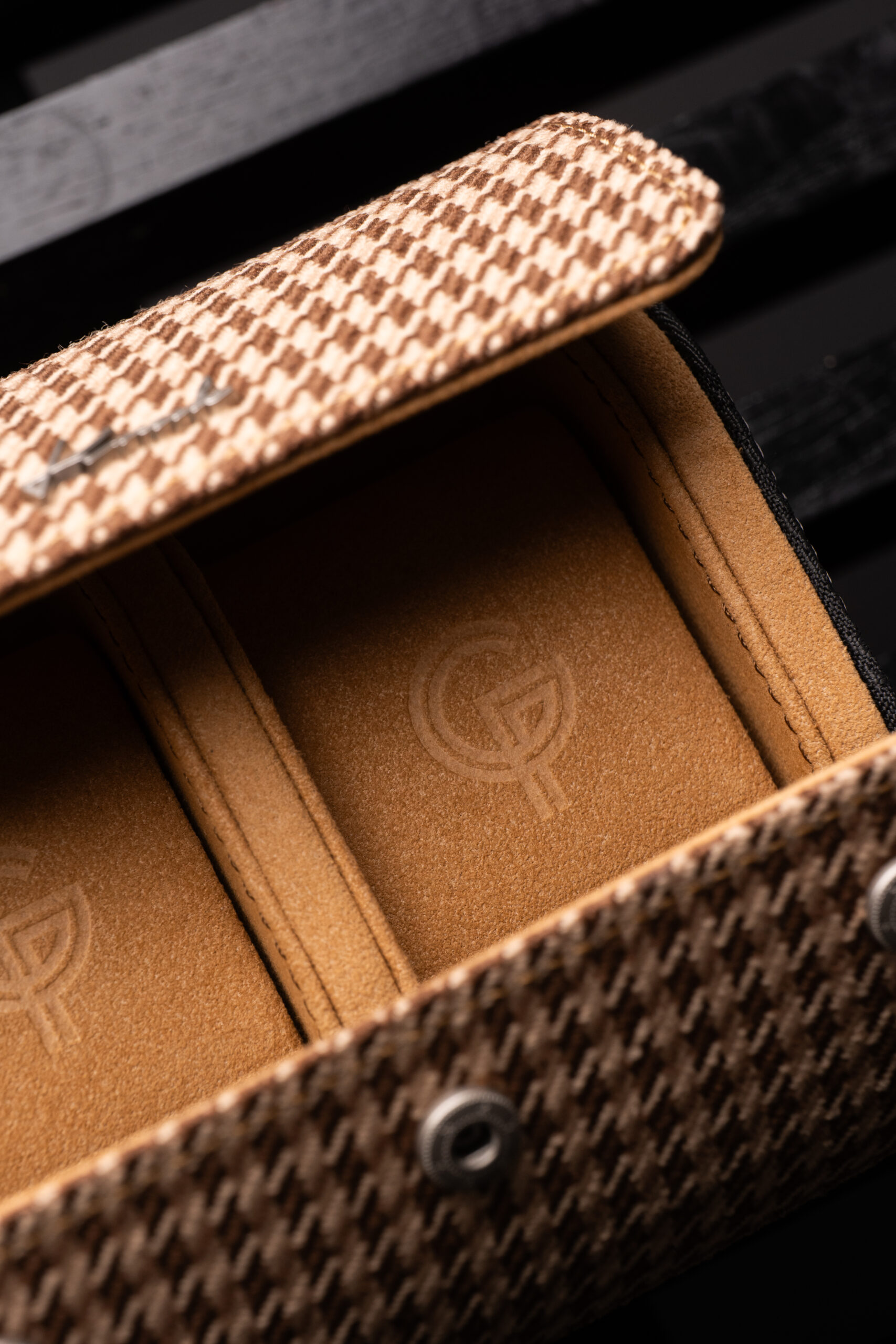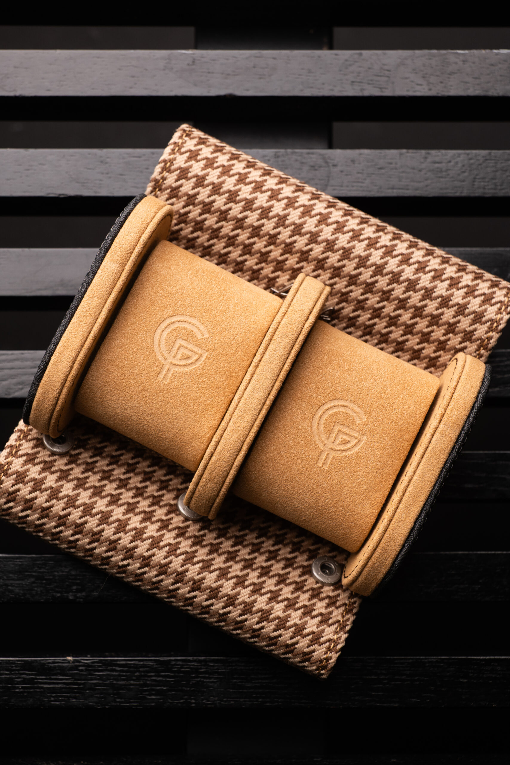 Description: When we saw our first Kruk watch roll we knew we needed to reach out for our first roll. We did not expect how popular our first collaboration would be and after selling out early we wanted to make sure that our GP editions stayed very limited. The rolls are made in the US and Italy with Italian fabrics and materials. The outer material is a butterscotch houndstooth peptia material that was inspired by the late 911 Porsche seat inserts. The sides of the case are a contrasting mid houndstooth pattern. The case is lined with a suede fabric that cushions and protects your watches during travel or simply as they rest on your desk.